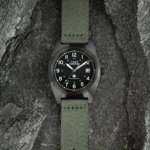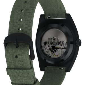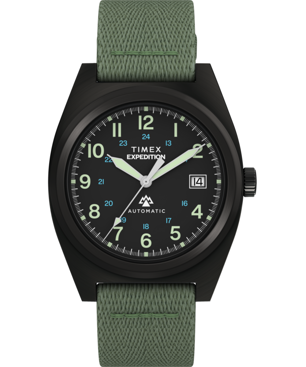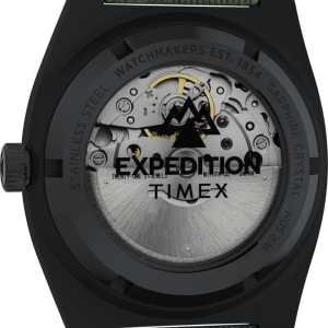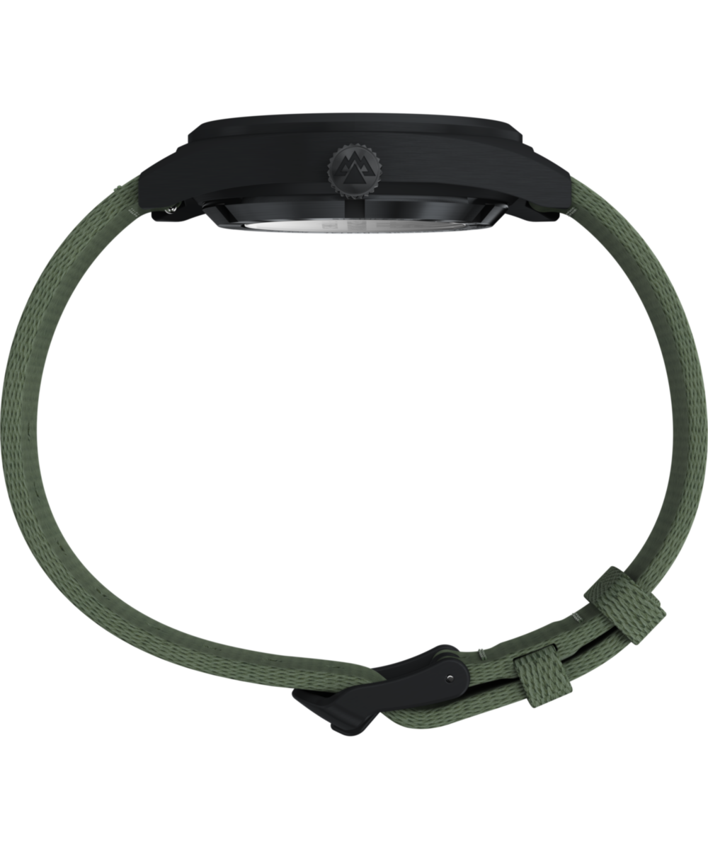Our Expedition Capstone Automatic brings a new 39mm brushed stainless-steel case to our Expedition collection. The dial is protected by a flat anti-reflective sapphire crystal and includes both 12 and 24-hour time indexes, luminant hands, and a date window beside 3 o’clock. Keeping in line with our commitment to protecting the wild spaces we love to explore, it’s paired with a two-piece green fabric strap that’s thoughtfully crafted from recycled plastic and equipped with quick-release spring bars for easy strap changes on the go. Flip the watch over, and you’ll find an exhibition window that allows for a view of the 21-jewel Japanese automatic movement ticking inside.