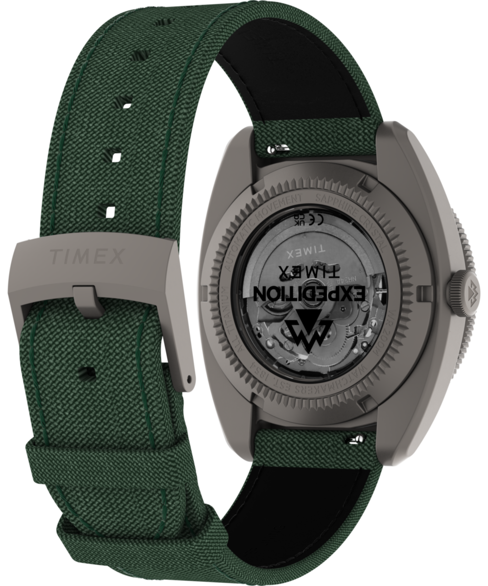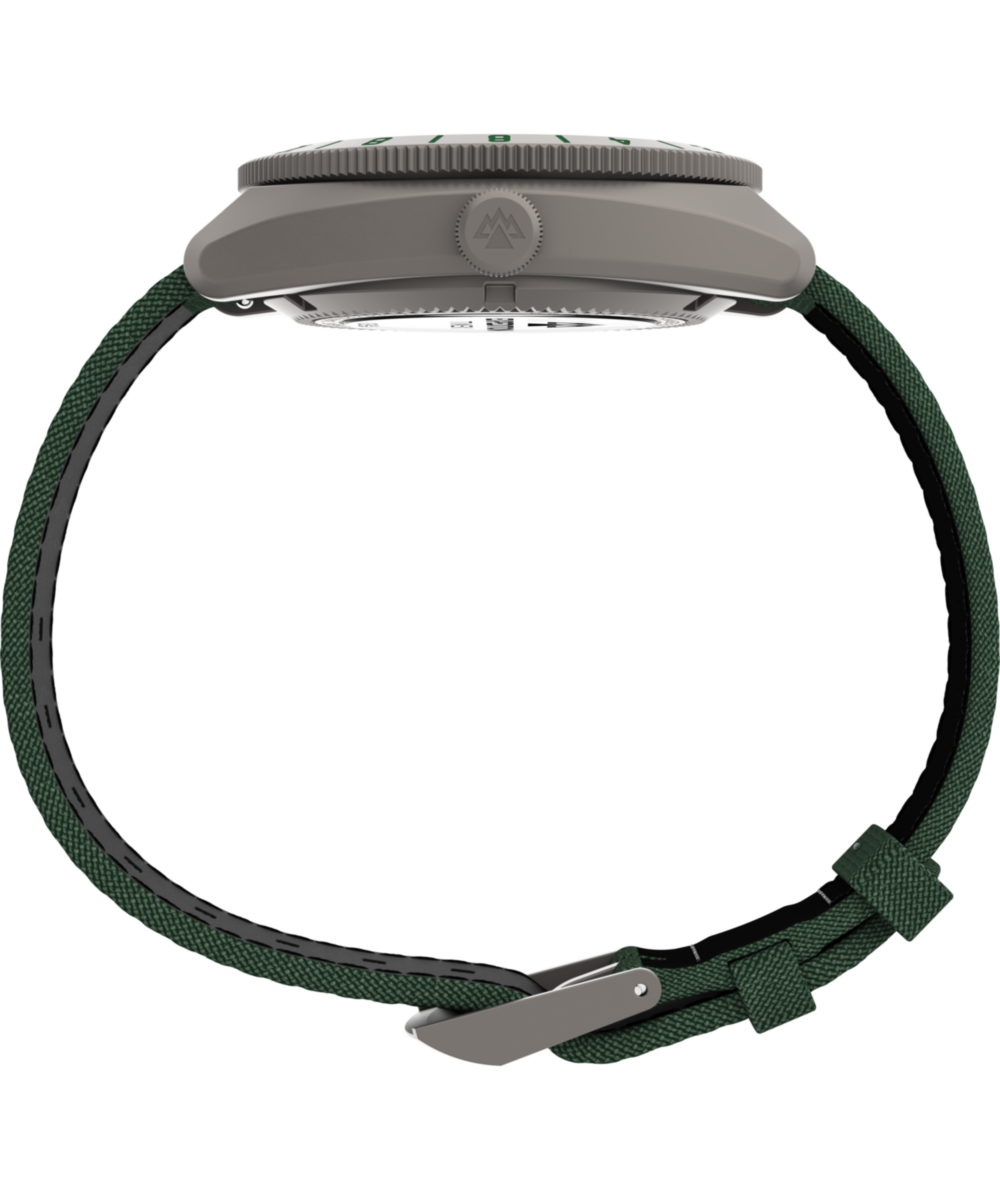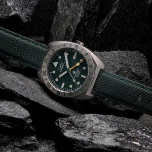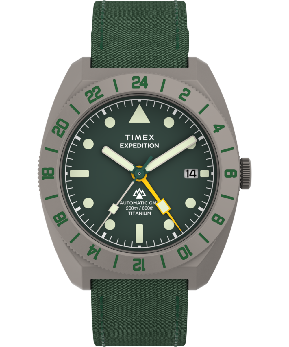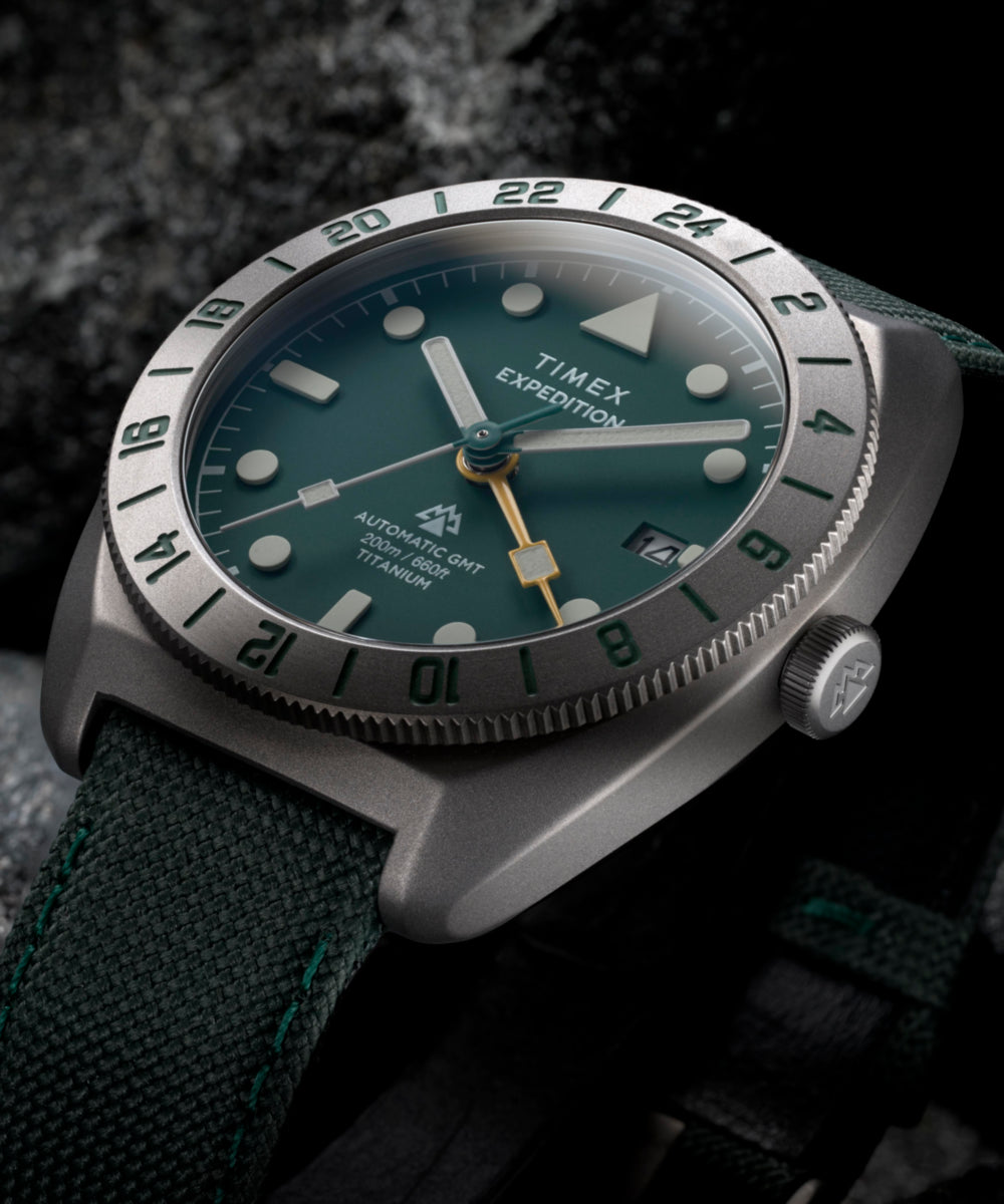 Our Expedition Pioneer GMT is built for adventurers who demand durability, functionality, and style in their timepiece. Crafted with a 41mm case rendered in titanium, it’s incredibly tough yet lightweight and comfortable on the wrist. Powering it is a Japanese automatic GMT movement for dual time zone tracking, complete with a bi-directional rotating bezel and a vibrant yellow GMT hand for easy reference on the green sand-blasted metal dial. We’ve equipped it with a sapphire crystal enhanced with anti-reflective coating for optimal clarity, an exhibition case back that allows for a view of the movement, luminant hands and markers, a date window at 3 o’clock, and 200m of water resistance. Topping it off is a textured fabric strap with leather backing and quick-release spring bars that allow for easy customization to suit your journey.