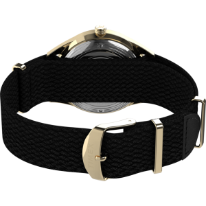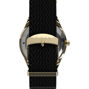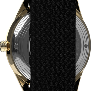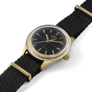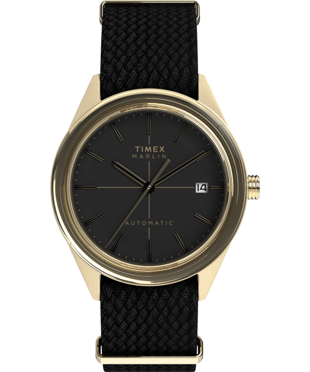 Our Marlin Jet captures futuristic design ideals of the ‘60s with understated details and a sleek 38mm brushed stainless-steel case. However, its most defining feature is the domed crystal. Made from Hesalite—a refined form of acrylic favored for its clarity and ease of maintenance—the crystal covers the entire top surface of the watch case, enveloping the grooved bezel bearing the Marlin name and bringing captivating depth to the watch’s retro-futuristic appearance. It blends seamlessly into the flat case sides, leaving only the lugs exposed. The case sides smoothly transition to a screwed-on exhibition case back that mirrors the crystal’s domed contour, enhancing the watch’s streamlined profile and space-age aesthetics. You’ll find a concentric circle pattern in three key locations on this timepiece: beneath the dome on the inner bezel, on the crown, and on the case back. The black, green, or blue matte concave dial showcases a crosshair pattern punctuated with a date window beside the 3 o’clock marker. Completing the look, we’ve paired the Marlin Jet with a double-layered black, green, or blue woven perlon strap that introduces a subtle textural element to its clean design.