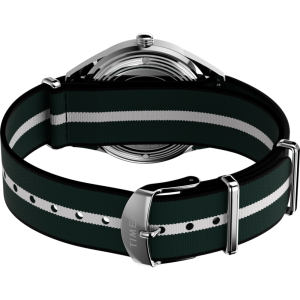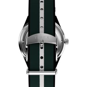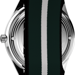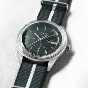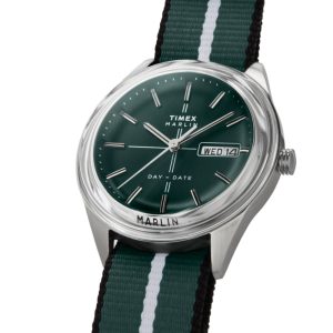 Our Marlin Jet captures futuristic design ideals of the ‘60s with understated details and a sleek 38mm brushed stainless-steel case. However, its most defining feature is the domed crystal. Made from Hesalite—a refined form of acrylic favored for its clarity and ease of maintenance—the crystal covers the entire top surface of the watch case, enveloping the grooved bezel bearing the Marlin name and bringing captivating depth to the watch’s retro-futuristic appearance. It blends seamlessly into the flat case sides, leaving only the lugs exposed. The case sides smoothly transition to a screwed-on case back that mirrors the crystal’s domed contour, enhancing the watch’s streamlined profile and space-age aesthetics. You’ll find a concentric circle pattern in three key locations on this timepiece: beneath the dome on the inner bezel, on the crown, and on the case back. The silver, blue, or green matte concave dial showcases a crosshair pattern punctuated with a day and date window beside the 3 o’clock marker, and we’ve paired this timepiece with a double-layered recycled fabric slip-thru strap that introduces a more casual element to its clean design.