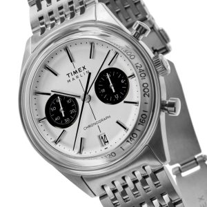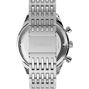 Our Marlin Jet Quartz Chronograph captures futuristic design ideals of the ‘60s with understated details and a sleek 40mm brushed stainless-steel case. However, its most defining feature is the domed crystal. Made from Hesalite—a refined form of acrylic favored for its clarity and ease of maintenance—the crystal covers the entire top surface of the watch case, enveloping the grooved bezel bearing a tachymeter index and bringing captivating depth to the watch’s retro-futuristic appearance. It blends seamlessly into the flat case sides, leaving only the lugs exposed. The case sides smoothly transition to a screwed-on case back that mirrors the crystal’s domed contour, enhancing the watch’s streamlined profile and space-age aesthetics. You’ll find a concentric circle pattern in two key locations on this timepiece: beneath the dome on the inner bezel and on the case back. The silver-tone concave dial showcases contrasting sub-dials and a date window beside the 6 o’clock marker. Completing the look is a brushed and polished stainless-steel 6-link bracelet.