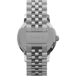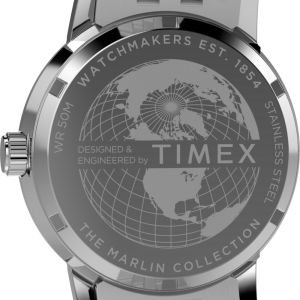 The Marlin Quartz GMT brings dual time zone tracking to our ‘60s Marlin. Housed in a 40mm polished stianless-steel case, the sunray dial presents faceted markers, a date window, and a sophisticated tonal GMT index accompanied by a prominent red triangle GMT hand. Keeping in line with its Marlin heritage, this timepiece features a vintage-style domed acrylic crystal, and we’ve paired it with a brushed and polished stainless-steel bracelet.