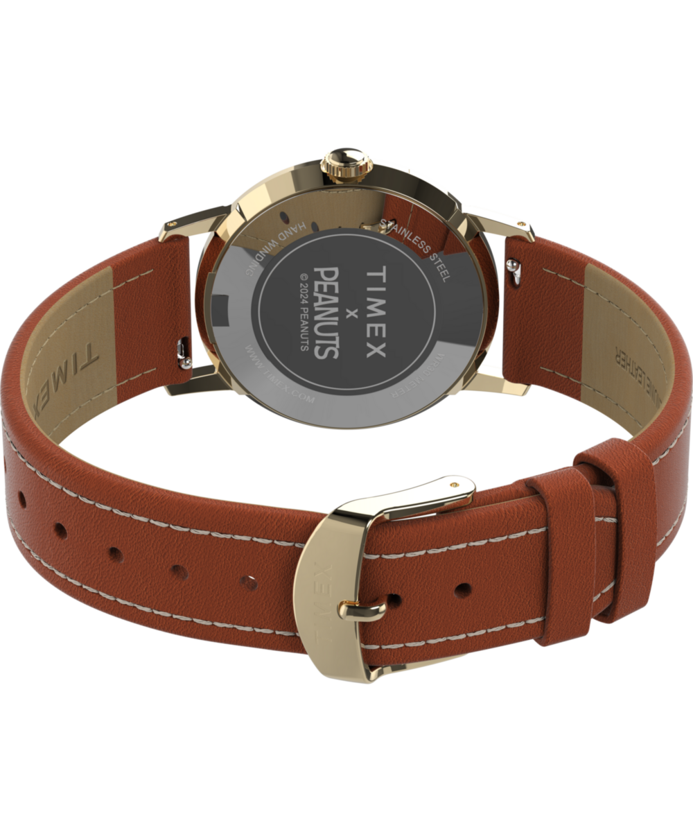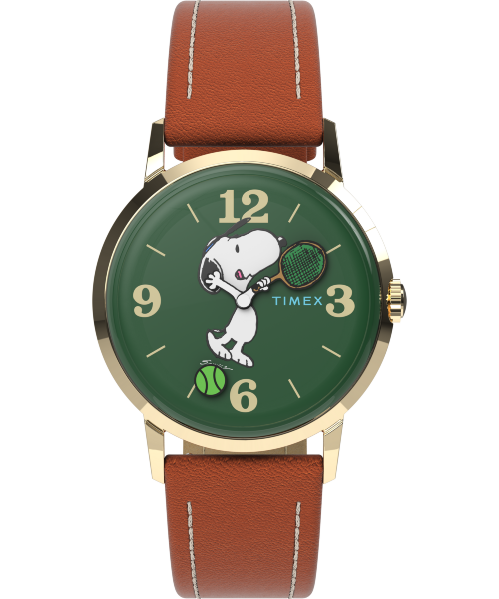 Match point! Snoopy plays on the dial of our iconic MarlinĀ® Hand-Wound as The World-Famous Tennis Player. This cheerful design captures Snoopy mid-serve with a tennis racket minute-hand and rotating tennis ball as the sweep-second. Featuring a stainless-steel case, a green dial, and a rich leather strap with contrast stitching, this watch makes for a classic Peanuts watch youāre sure to love on and off the court.