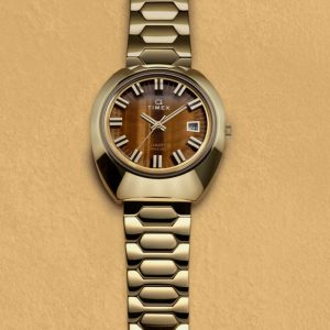 This 1972 blast from the past is an archival quartz watch that delivers ‘70s boldness from every angle, boasting a substantial 39mm stainless-steel tonneau case with all-around polished finishing. You’ll find our usual attention to detail with dimensional floating hour markers that hover above the striking tiger’s eye dial, plus a polished handset to match, a trapezoidal date window, and a period-correct domed acrylic crystal on top. Completing the look, a bold geometric bracelet thoughtfully crafted from polished stainless steel adds a modern edge to this nostalgic, reissued design.