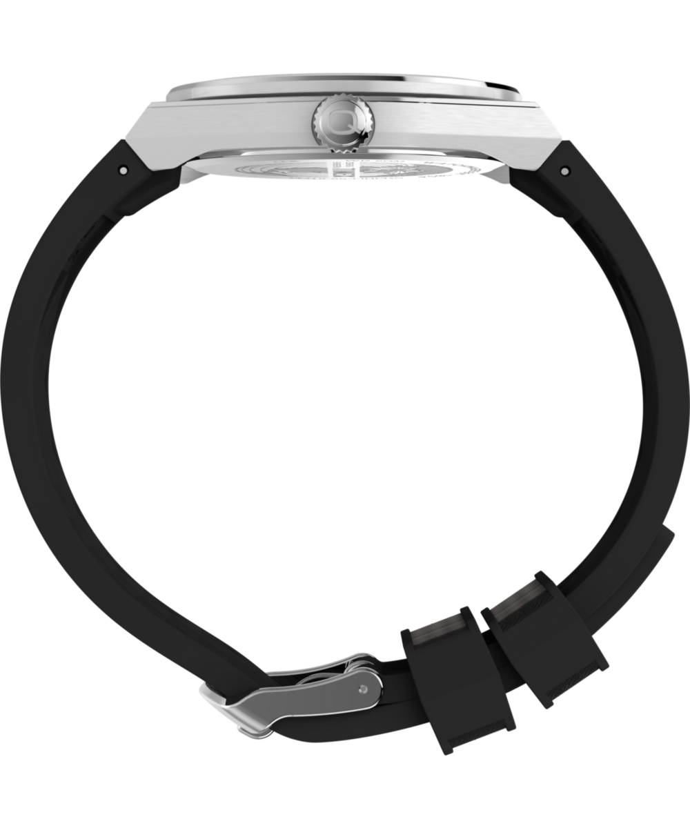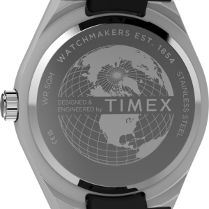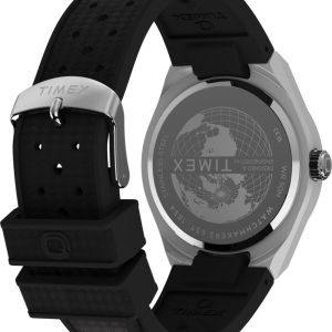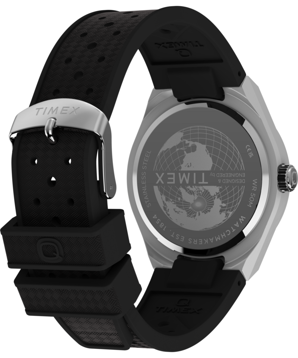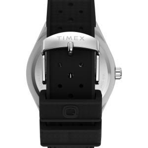 Channeling the bold designs and decadent glamour that filled the scene in ‘70s West Hollywood, the Q Timex® Continental GMT brings refinement to our beloved Q Timex collection with a streamlined 39mm brushed stainless-steel case with polished edges and a sleek GMT window at 6 o’clock. The simple black dial features a radial texture and a clean presentation that’s effortlessly cool, highlighted by faceted hour markers, luminant hands for enhanced visibility in the dark, and a glanceable date window beside the 3rd hour marker. The textured black synthetic rubber strap that’s perforated makes for a more laid-back look as you let the hours slip away.
