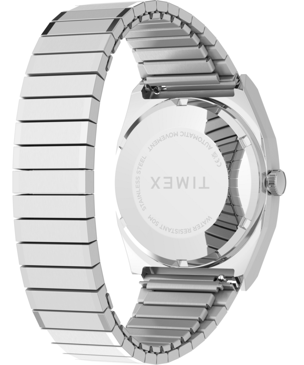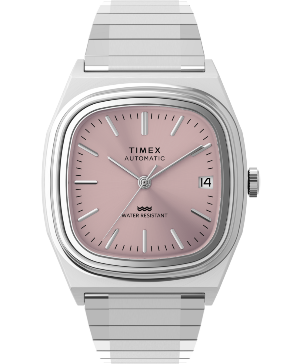 Originally unleashed onto the scene in 1983, the Timex Automatic 1983 E Line was a classic dress watch distinguished by a rounded square case shape affectionately dubbed the ‘TV Dial.’ This thoughtful color update features a brushed and polished stainless-steel case and coordinating expansion band enhanced with our Perfect Fit technology. It’s powered by a Miyota caliber 8215 Japanese automatic movement with 21 jewels, and completing its smooth profile is a vintage-style flat acrylic crystal, distinct applied hour markers, a simple printed minute track, and a discreet date window seamlessly integrated into the light pink dial at 3 o’clock.