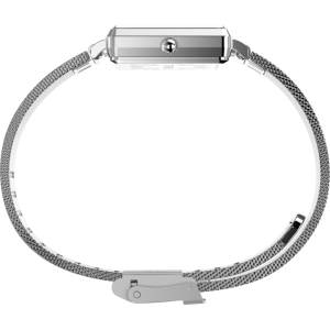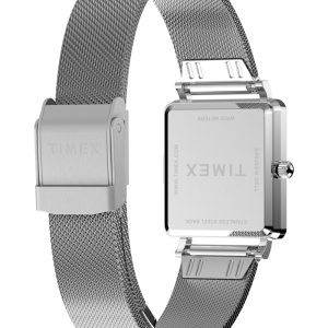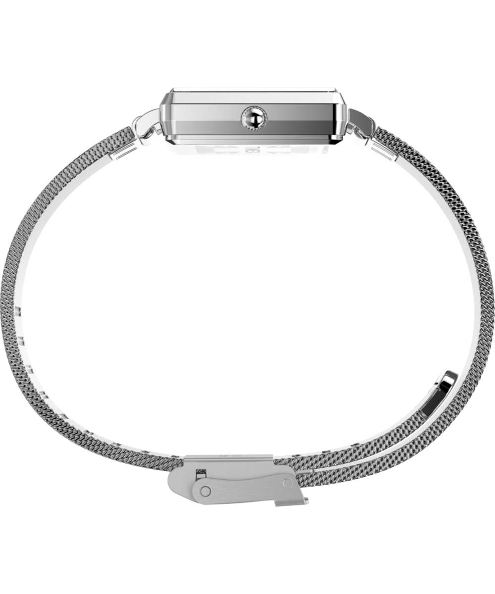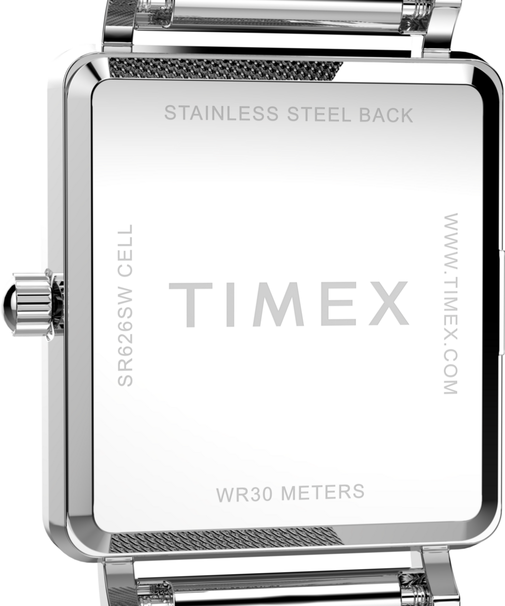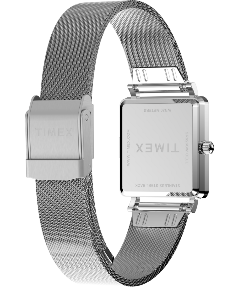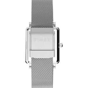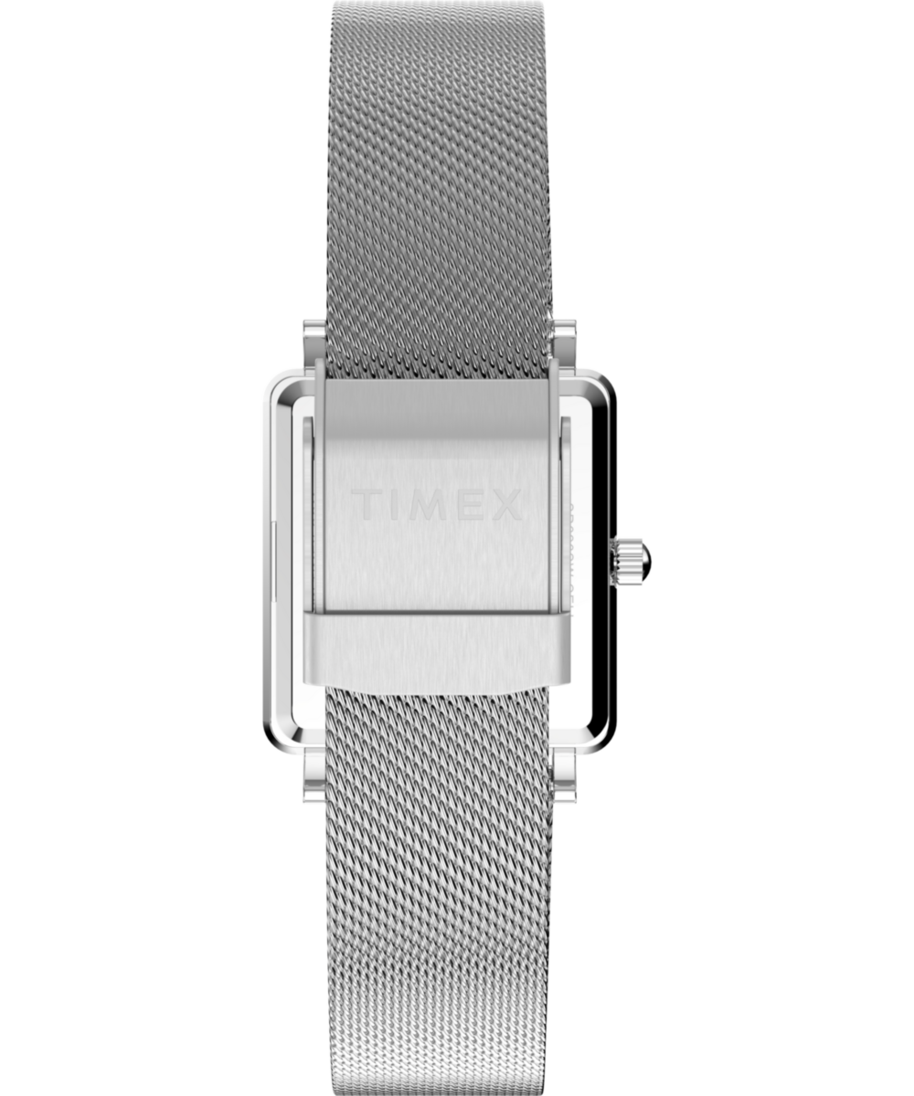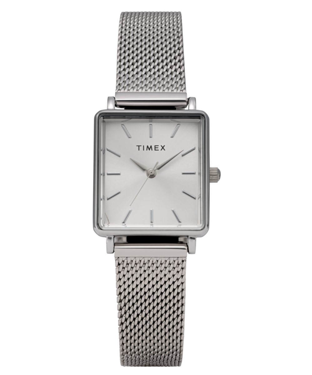 Our minimalist wristwatch, now with a fresh rectangular case for a sharper, more modern edge. All-polished finishing brings timeless elegance to the 22mm case and stainless-steel mesh band on this petite timepiece, while the silver sunray dial with alpha hands and simple markers offers a clean look you can pair with just about anything.