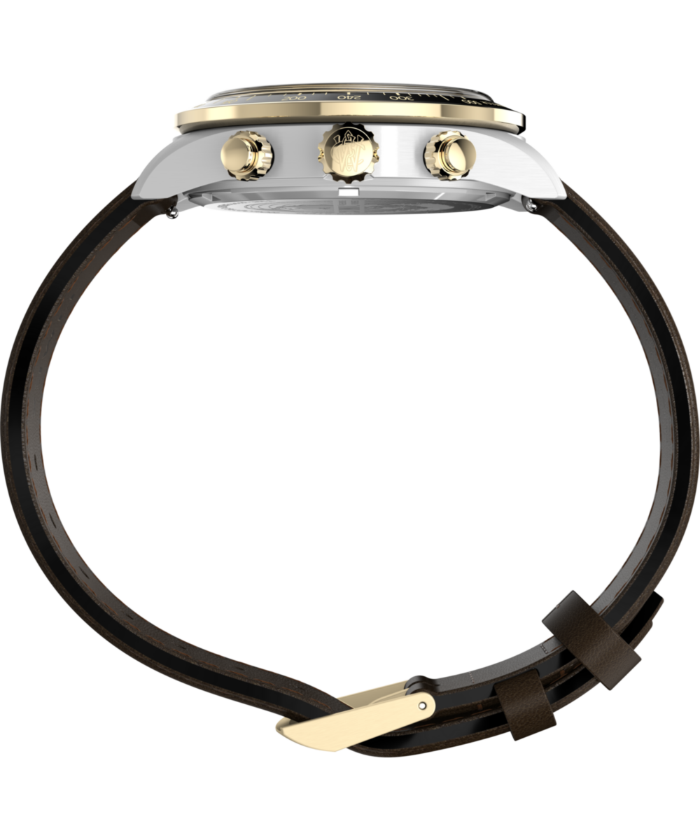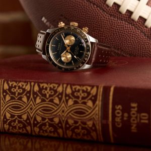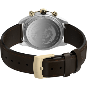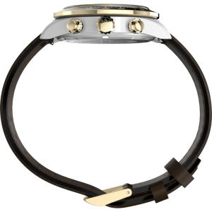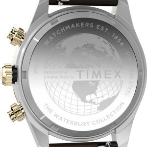 The Waterbury Heritage Chronograph combines modern functionality with timeless design, featuring a chronograph to track elapsed time and a black stainless-steel tachymeter bezel for determining average speed. Encased in a robust 39mm stainless-steel case with vertical brushing, the black dial is accented by contrasting sub-dials and safeguarded by an anti-reflective mineral glass crystal. Luminant hands ensure enhanced visibility, while applied indices and intricate detailing on the crown and pushers add a refined touch. Versatility is key, with a brown natural leather strap that’s perforated for breathability and equipped with quick-release spring bars for effortless strap changes, no tools required.