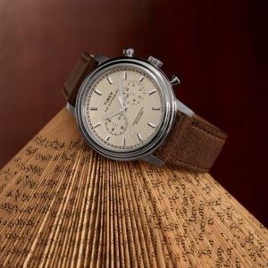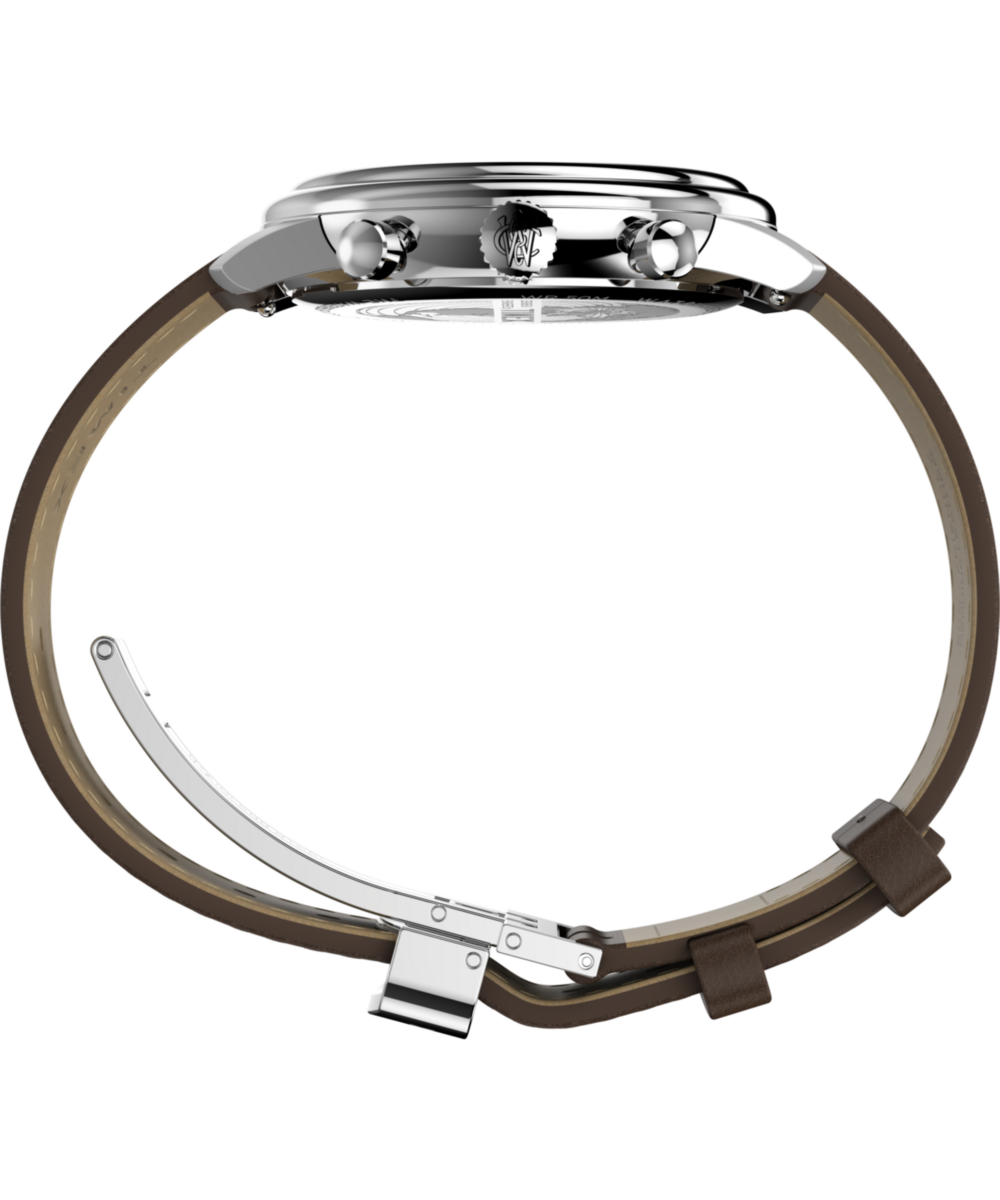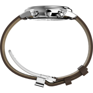 Defined by sharp lines and sweeping curves, the Waterbury Metropolitan features an enhanced 41mm stainless-steel case with an elegant two-tiered bezel. Encircling the cream dial are beveled markers and a rail track, paired with a sleek handset. This sophisticated timepiece is equipped with a two sub-dial chronograph movement for tracking elapsed time and is offered with a distressed brown natural leather strap ethically sourced from the Leather Working Group (LWG) and complete with a deployant buckle.