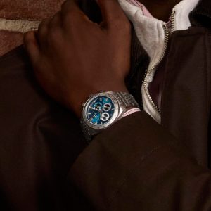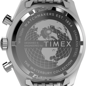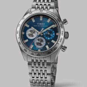 Our Waterbury Traditional Chronograph is built with a sturdy 41mm stainless-steel case and equipped with a chronograph movement for tracking elapsed time and a tachymeter bezel for determining average speed. Unique tonal sub-dials bring an understated and sophisticated color contrast to its blue dial, which houses a date window between 4 and 5 o’clock and bold hour markers punctuated by brilliant red. The crown proudly displays the Waterbury Watch Company logo, and the pushers are enhanced with a crosshatch texture. Opt for a totally stainless-steel look with a stainless-steel bracelet.Â