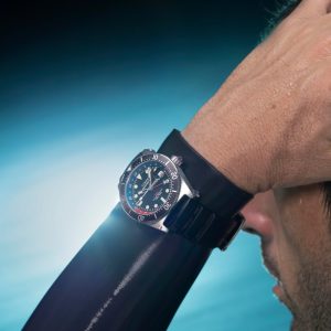 This watch is suitable for swimming, snorkelling, surfing and recreational scuba-diving. To maintain water resistance, do not press any buttons while underwater.