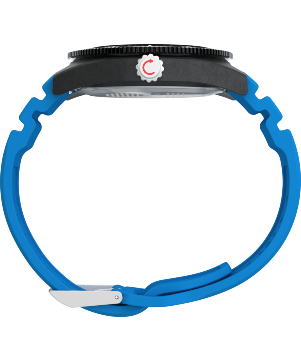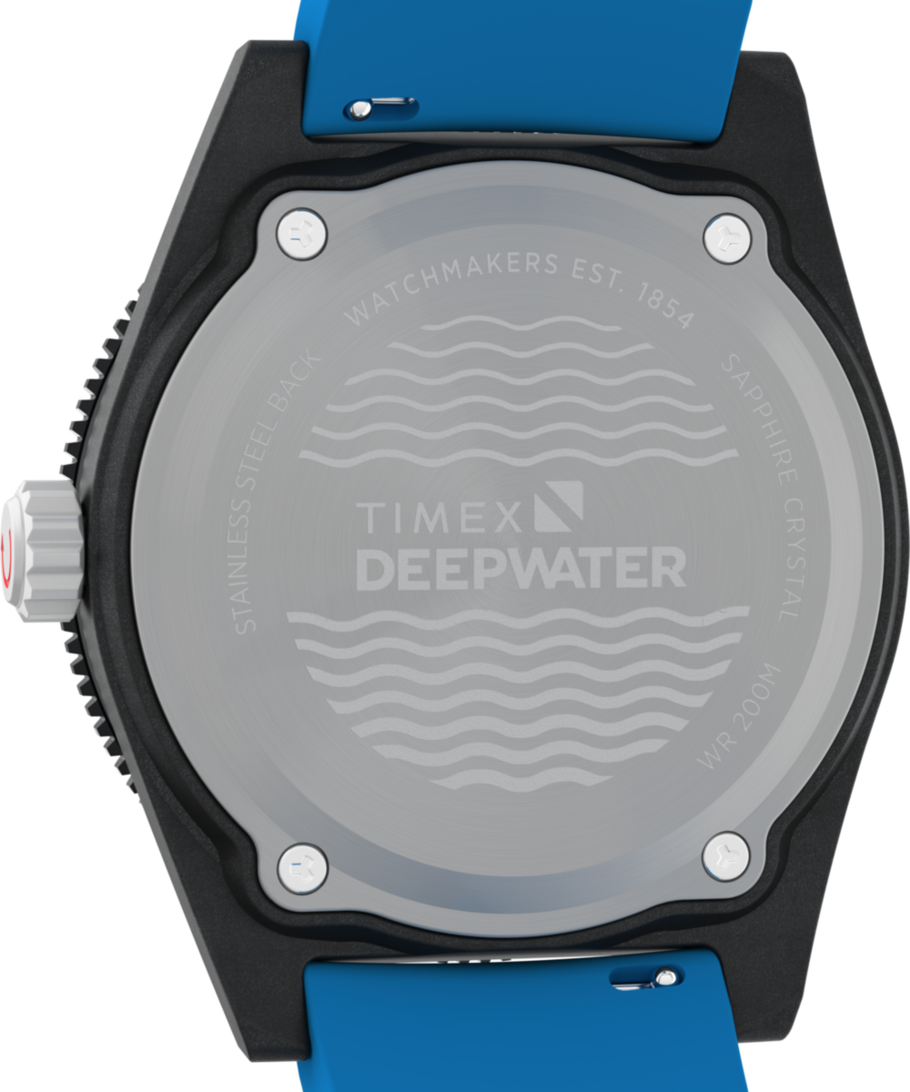 Merging resilience and elegance with crucial functions for underwater pursuits, our Deepwater Reef 200 XCF is expertly built to venture deeper. We’ve updated it with a sturdy 43mm case that’s lighter than aluminum and stronger than traditional resin, made from a tough combination of mixed polycarbonate with extended carbon fibers (XCF). Powering it is a reliable quartz movement, and we’ve equipped it with a sapphire crystal with anti-reflective coating, a unidirectional ratcheting stainless-steel top ring, and Super-Luminova® hands and hour markers providing the luminosity you rely on as you venture below. A unique wave pattern brings dimension to the black dial, while a debossed bright blue synthetic rubber strap ensures durability and style both in and out of the water. With 200m of water resistance reinforced by a screw-down crown, this timepiece is ready to explore beyond the edge.