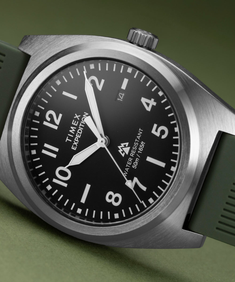 Our Expedition Capstone brings a new 39mm brushed case to our Expedition collection. The dial is protected by a flat mineral glass crystal and includes luminant hands and a date window beside 3 o’clock. We’ve paired it with a two-piece green or black silicone strap that’s soft and flexible on the wrist and equipped with quick-release spring bars for easy strap changes on the go.