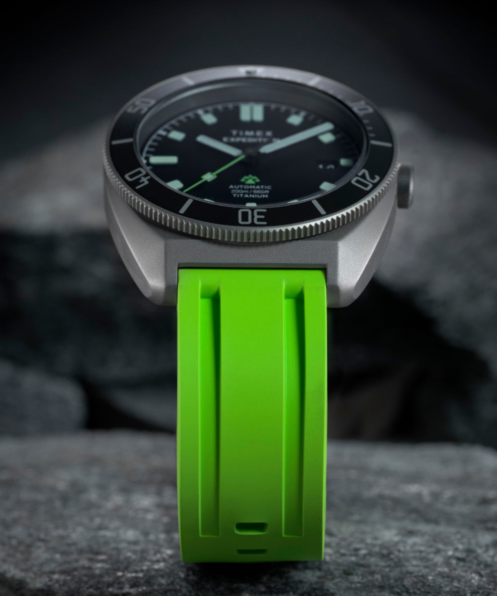 The Expedition Pioneer Automatic is ready to go the distance with a new 41mm barrel-shaped case rendered in titanium that’s incredibly durable yet lightweight on the wrist. Its unidirectional ratcheting bezel includes an elapsed time scale, while the case back’s exhibition window reveals the battery-free automatic movement ticking inside. The black sand-blasted metal dial presents a date window and Super-Luminova® in-fill on the hands and markers for better visibility at night, and it’s protected by an anti-reflective sapphire crystal for a clear view of the dial in bright conditions. Built for the unpredictability of the outdoors, it offers 200m of water resistance and a rugged HNBR synthetic rubber strap complete with quick-release spring bars that allow for easy customization to suit your journey.