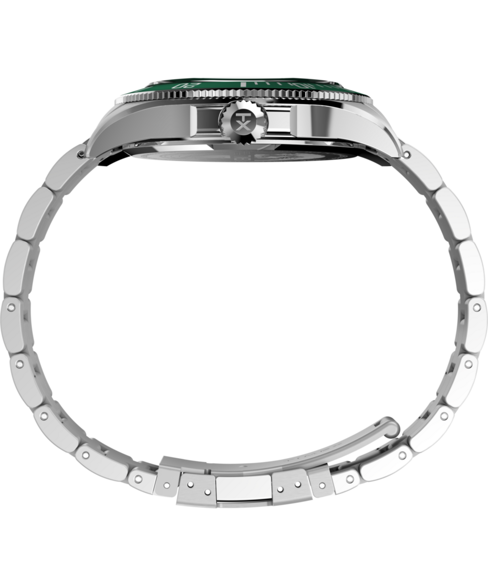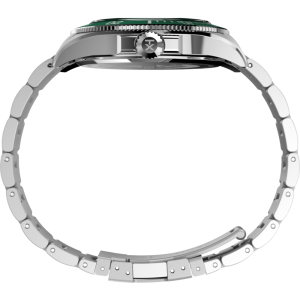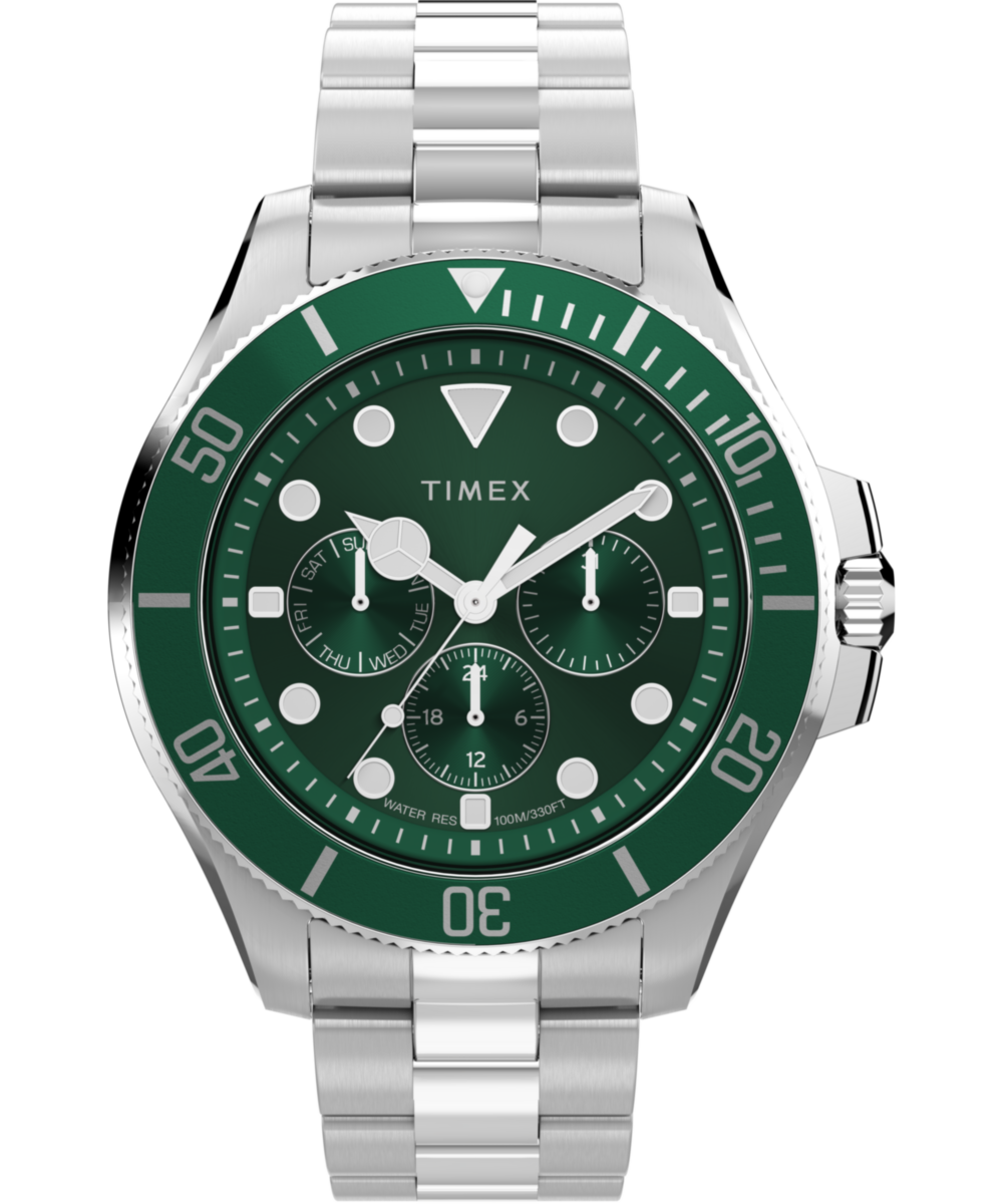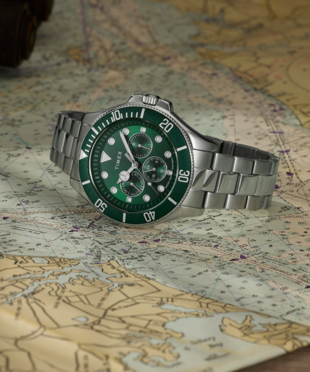 This update to our Harborside Coast features a fully stainless-steel build and a new multi-function movement. The green sunray dial is enriched with sub-dials that track the day of the week, the date, and the time in a 24-hour format. A unidirectional bezel with elapsed time scale brings true diver-inspired functionality, while luminant hands and markers ensure readability long after sundown. Rugged yet refined, the Harborside Coast is built for everyday versatility with the kind of specs and style you’d expect in a modern sport watch.
