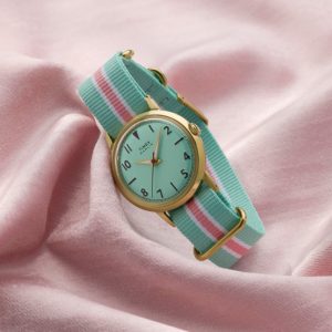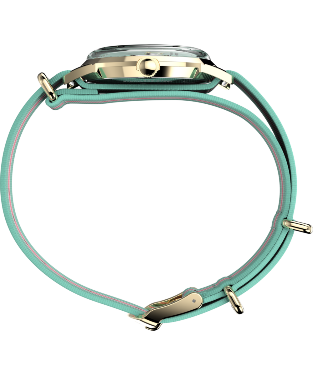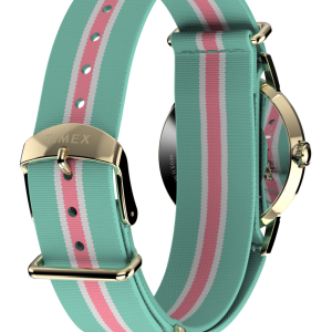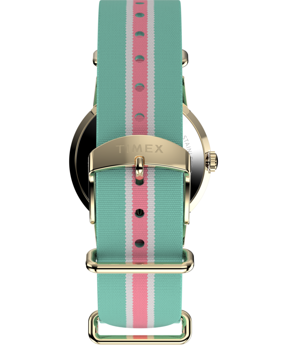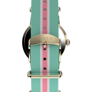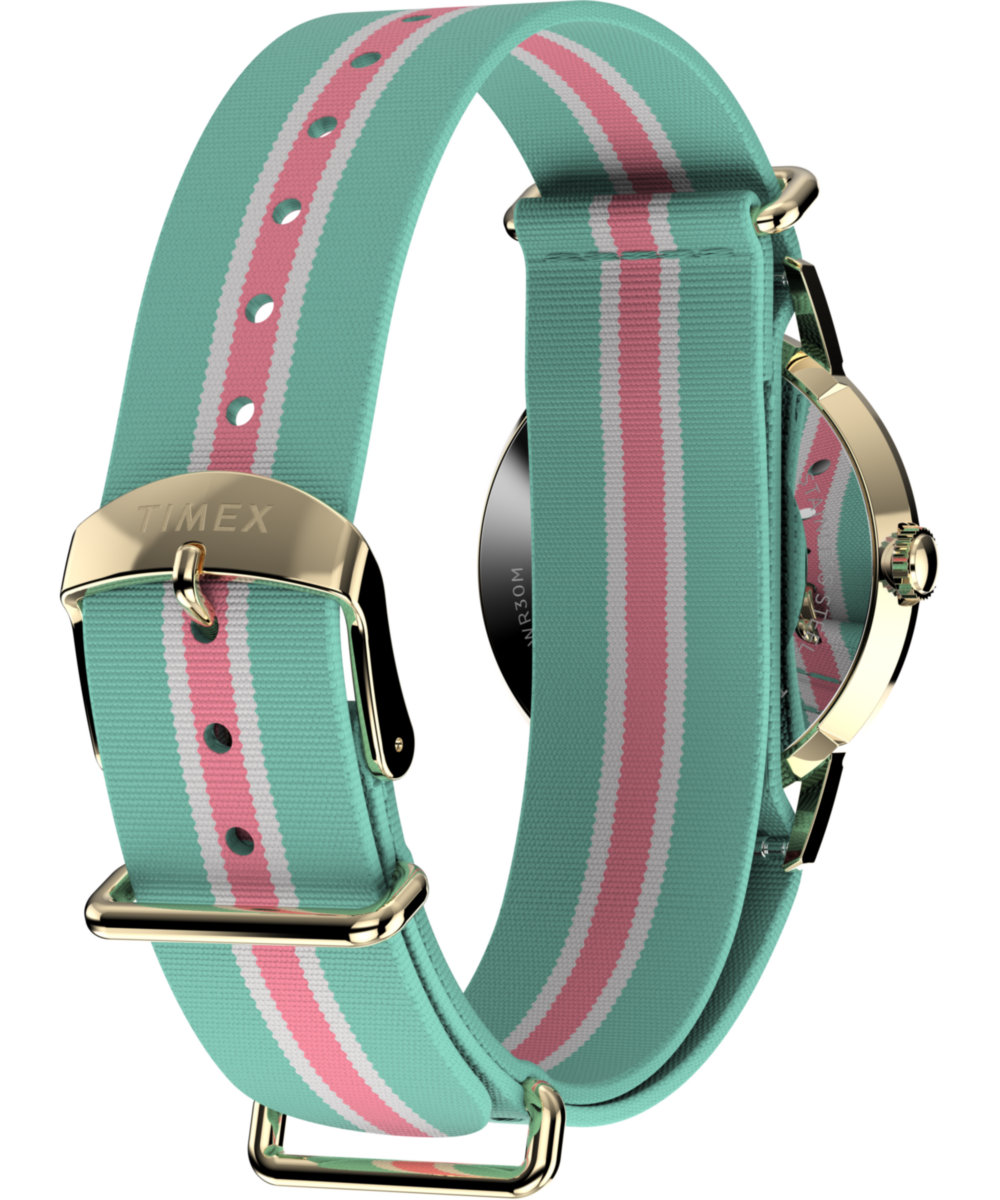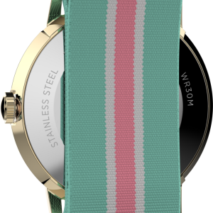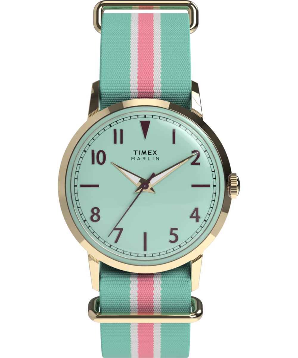 We’ve refreshed our 34mm Marlin with preppy stripes and pretty tones that are fun, fresh, and decidedly feminine. A polished gold-tone stainless-steel case frames a clean mint dial, which presents a mix of stick and Arabic numerals and a sharp handset that’s luminant for better readability at night. Completing the look is a striped fabric strap that’s double-layered for durability and complete with a slip-thru design for a comfortable fit all day, every day.