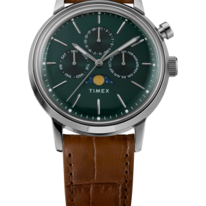 Our Marlin® Moon Phase Multifunction pays tribute to the great minds that propelled mankind to the moon with a sub-dial that faithfully mirrors the lunar cycle. This gorgeous rendition of our ‘60s Marlin features a sophisticated 40mm stainless-steel case and a calendar movement with sub-dials that indicate the day of the week, the month, and the date. The dial is complete with hand-applied indices and appears in timelessly rich colors, paired a traditional crocodile-patterned leather strap.Â