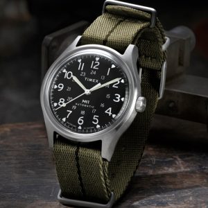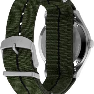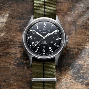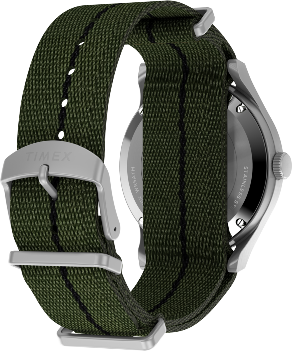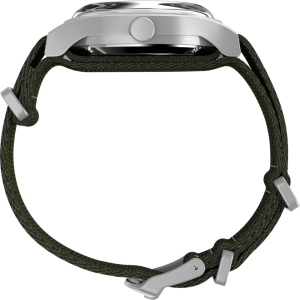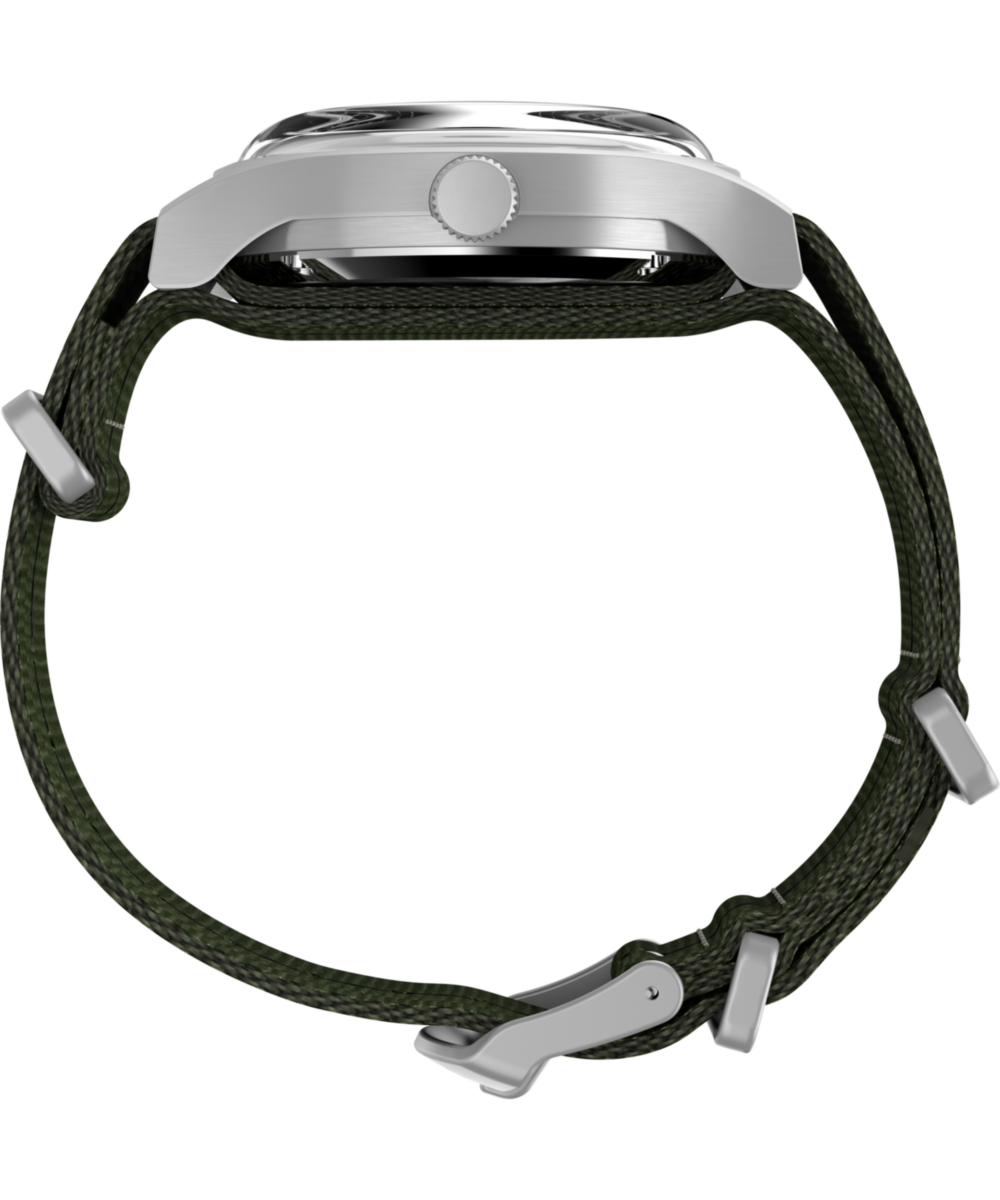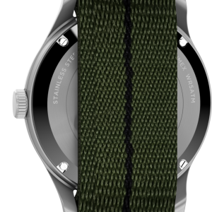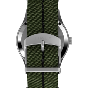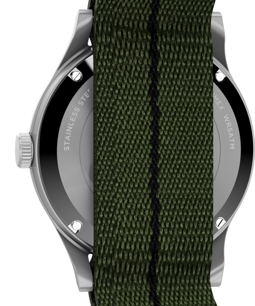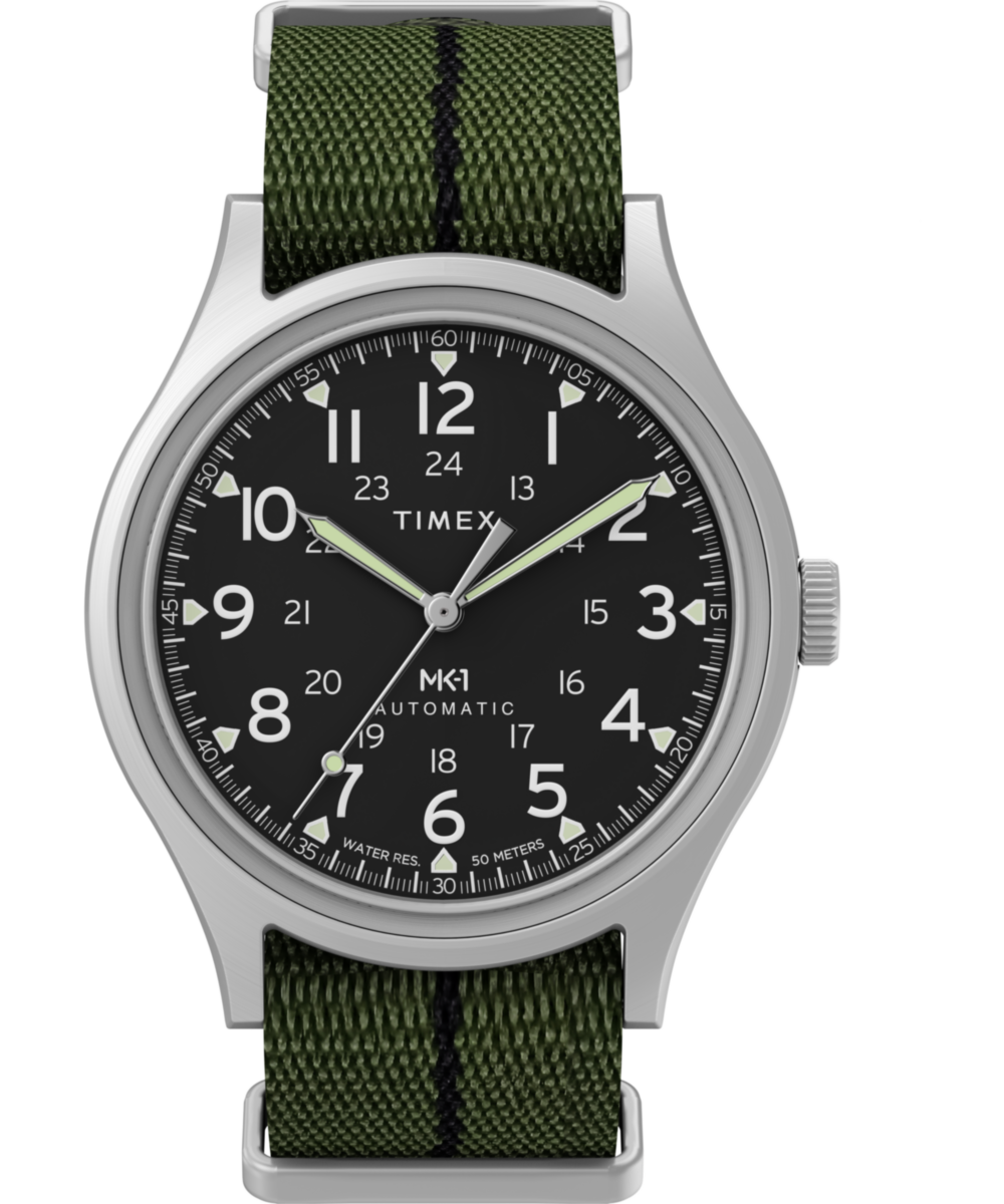 We’re reinventing our beloved MK1®, enhancing its classic military aesthetic with a blue-tinted exhibition window on the case back that reveals the reliable Japanese automatic movement ticking inside. The 40mm stainless-steel case and domed acrylic crystal encase a sleek black dial with both 12 and 24-hour Arabic indices and luminant hands for enhanced visibility. Completing the look is a double-layered olive-green fabric strap.