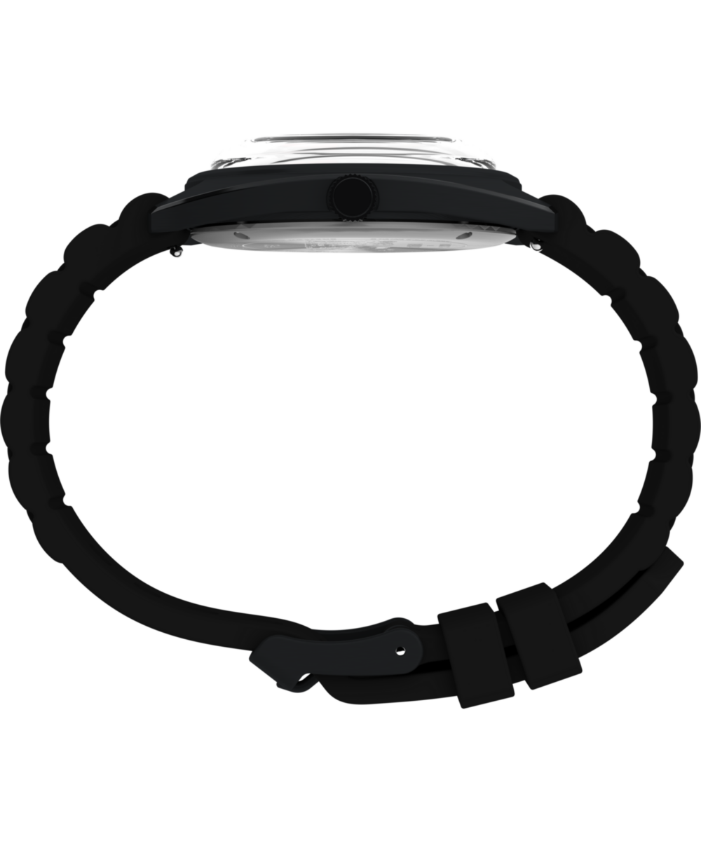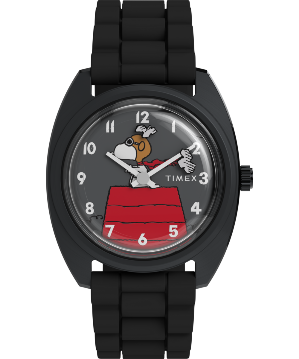 Take flight with Snoopy as The Flying Ace in this playful reimagining of a ‘70s Timex favorite. Inspired by the 1979 original, this updated design honors the spirit of the classic while introducing subtle refinements. The dial artwork has been slightly refreshed, featuring your favorite beagle perched atop his iconic red doghouse while rotating clouds serve as the second hand. A black stainless-steel case ensures durability, while a vintage-style domed acrylic crystal adds a bit of retro charm and a flexible silicone strap styled like a bracelet completes the look.