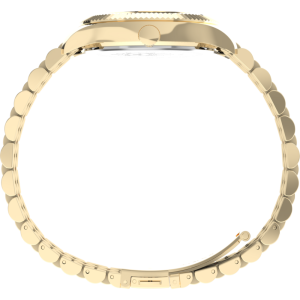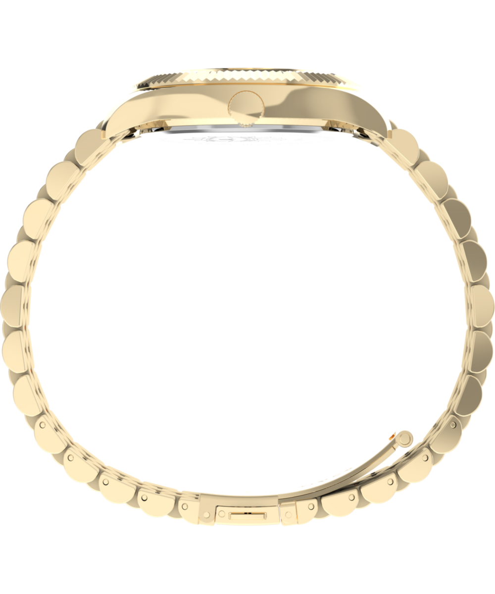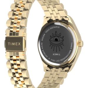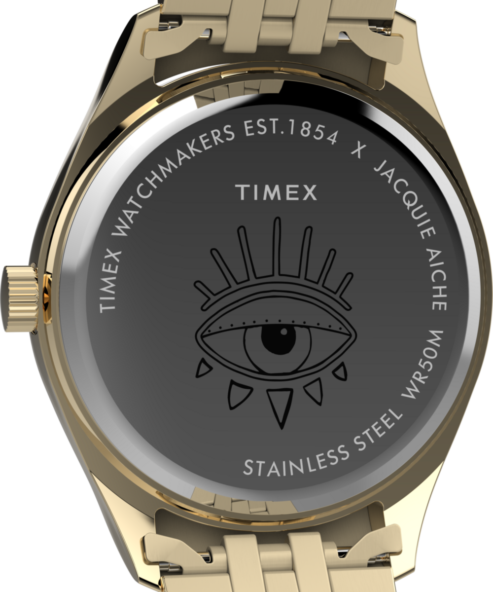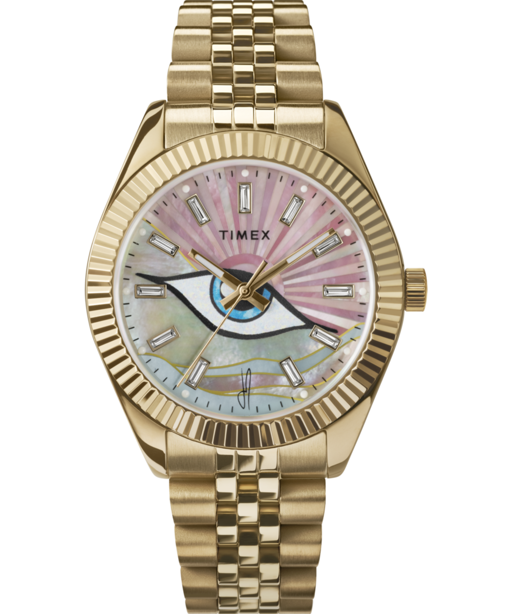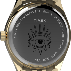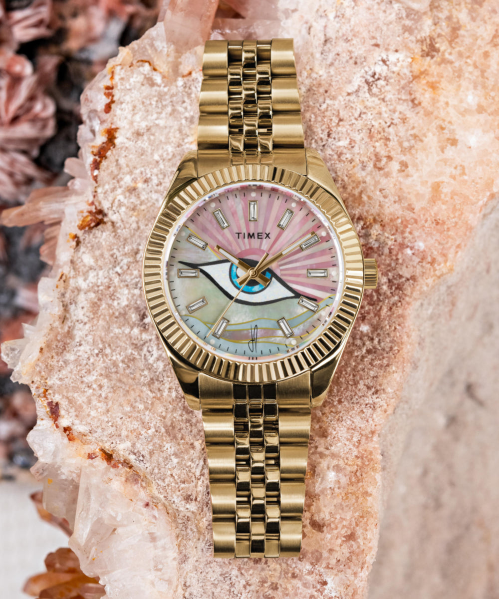 Designed to be a talisman of clarity, protection, and trust in the journey ahead, the Timex x Jacquie Aiche Guiding Light timepiece features a mosaic dial pieced together from shimmering mother-of-pearl. Central to the design is Jacquie’s signature tribe eye motif, with the brilliant beams of the sun above and the soothing waves of the sea below. Faceted Austrian crystals mark the hours, while the 36mm gold-tone stainless-steel case and bracelet illuminate your wrist stack with a warm glow.