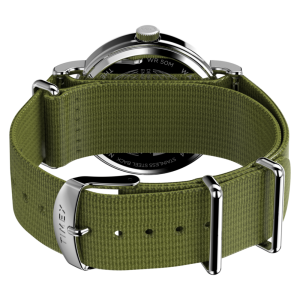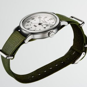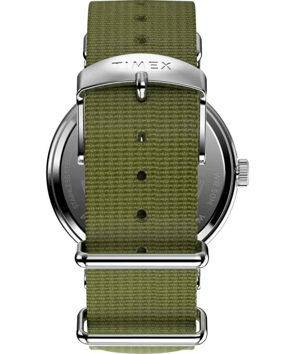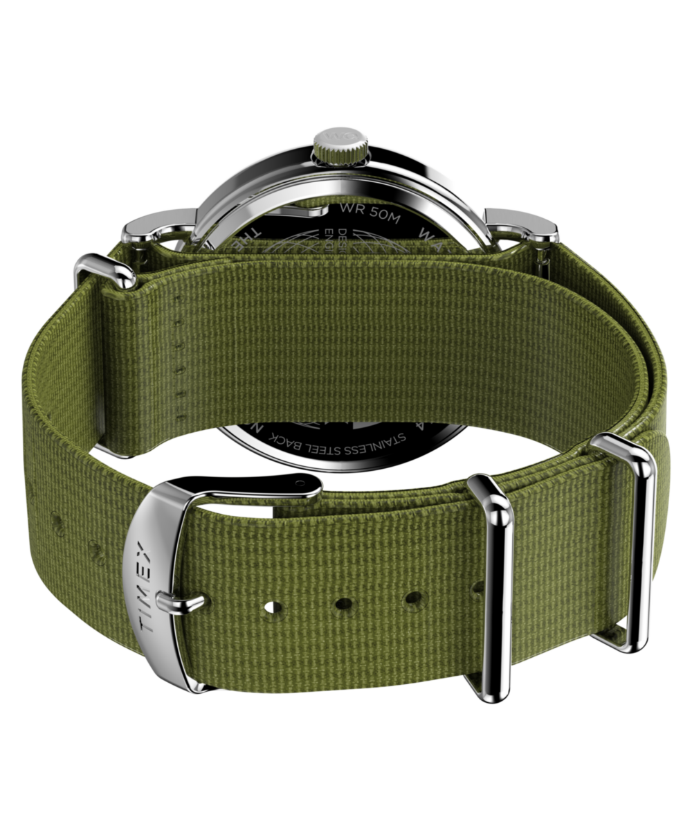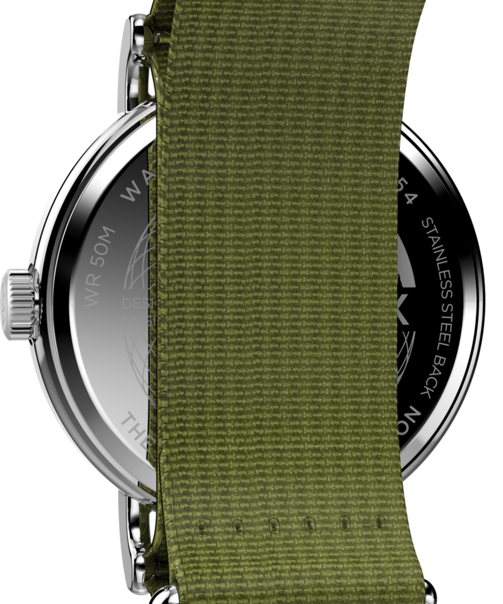 We’re bringing a fresh burst of energy to our beloved Weekender with elevated details, like a sleek new 40mm case, a new crown design, and a slip-thru strap design that makes it easy to swap out the eco-friendly recycled fabric strap for one in another color or print. It’s equipped with luminous hands and our INDIGLO® backlight, and on the white dial, you’ll find a date window complete with a magnifier for enhanced viewing, both 12- and 24-hour time indexes, and the iconic “we.” logo of the Timex Weekender as a reminder that any boring old day can become unforgettable if it’s spent with our favorite people.