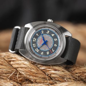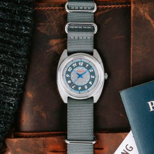 A playful reinterpretation of the traditional field watch, our fourth annual collaboration with Worn & Wound blends classic military inspiration with a healthy dose of personality. The dial breaks convention with a tiered, ringed layout that plays on the idea of a sector dial—13–24 at center, 1–12 mid-ring, and a clean minute track around the edge—all separated by sharp railroad markings. Medium gray fills the center and outer sections, while the ring beneath the hours is charcoal. Thin rings of sky blue break up the grays, and white 13–24 numerals pop against the background. The hands are dark blue with a red-tipped seconds hand that adds just the right flash of energy. Each numeral and hand is filled with thick C3 lume, ensuring visibility when the sun calls it quits. Housed in our familiar 37mm stainless-steel case—a compact, vintage-inspired barrel shape topped with a massive domed crystal—this field watch delivers the same rugged reliability that’s defined all of our Worn & Wound collaborations. It all comes together on a grey double-layered fabric strap, and inside, the hand-wound Sea-Gull TY6 movement gives you the tactile pleasure of daily winding, a ritual that connects you to the watch in a way quartz can’t.